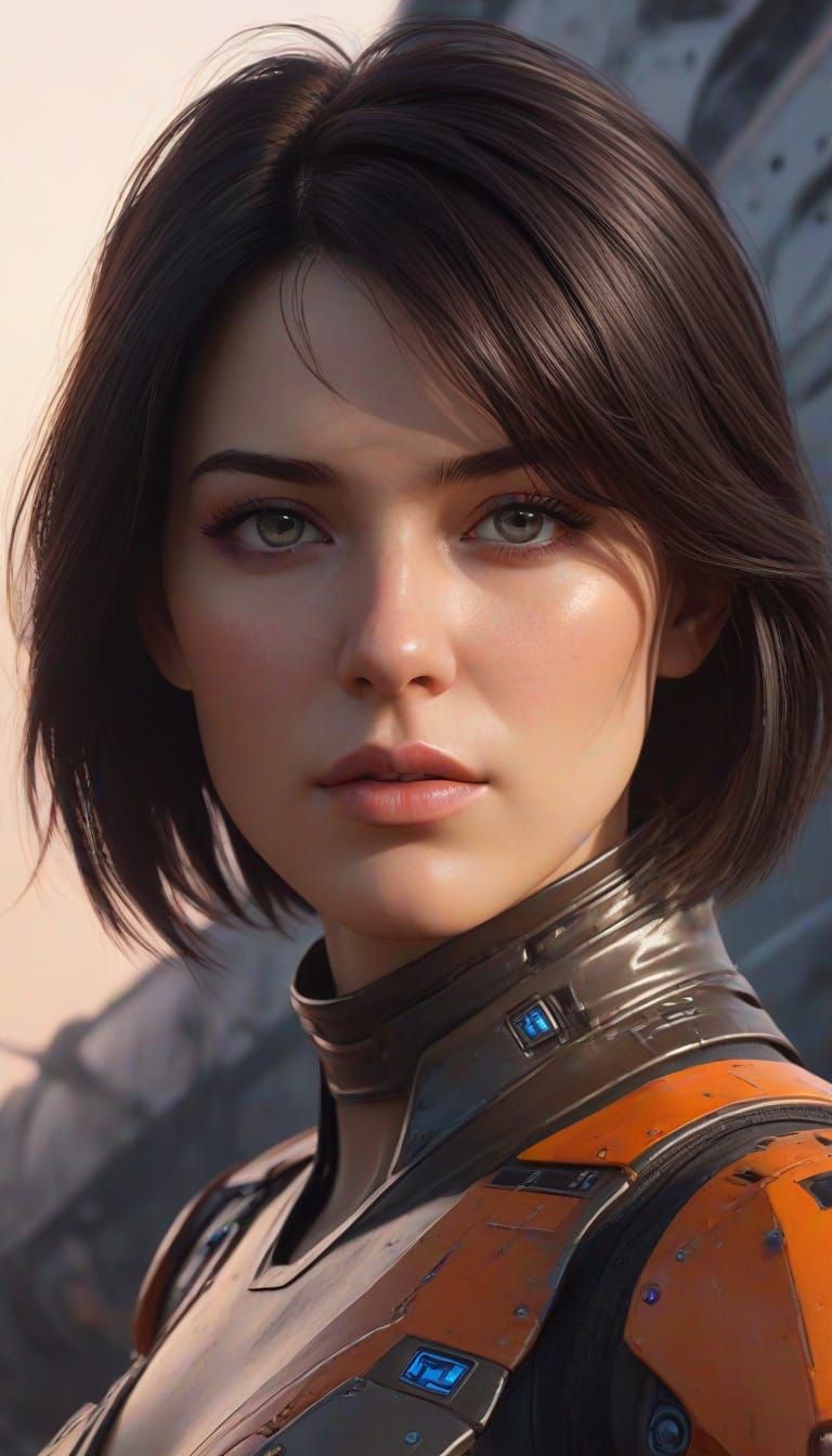 This image shows a stunning science fiction portrait of a young woman with striking features, standing in front of a futuristic space battleship in a vibrant, intricately detailed environment, reminiscent of high-end digital art.