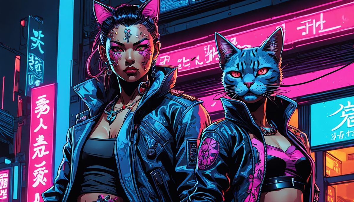 This image shows a cyborg cat and vampire bounty hunter duo in a cyberpunk aesthetic. They are sporting yakuza-inspired outfits with neon tattoos and glossy accessories under electric blue and pink lights.