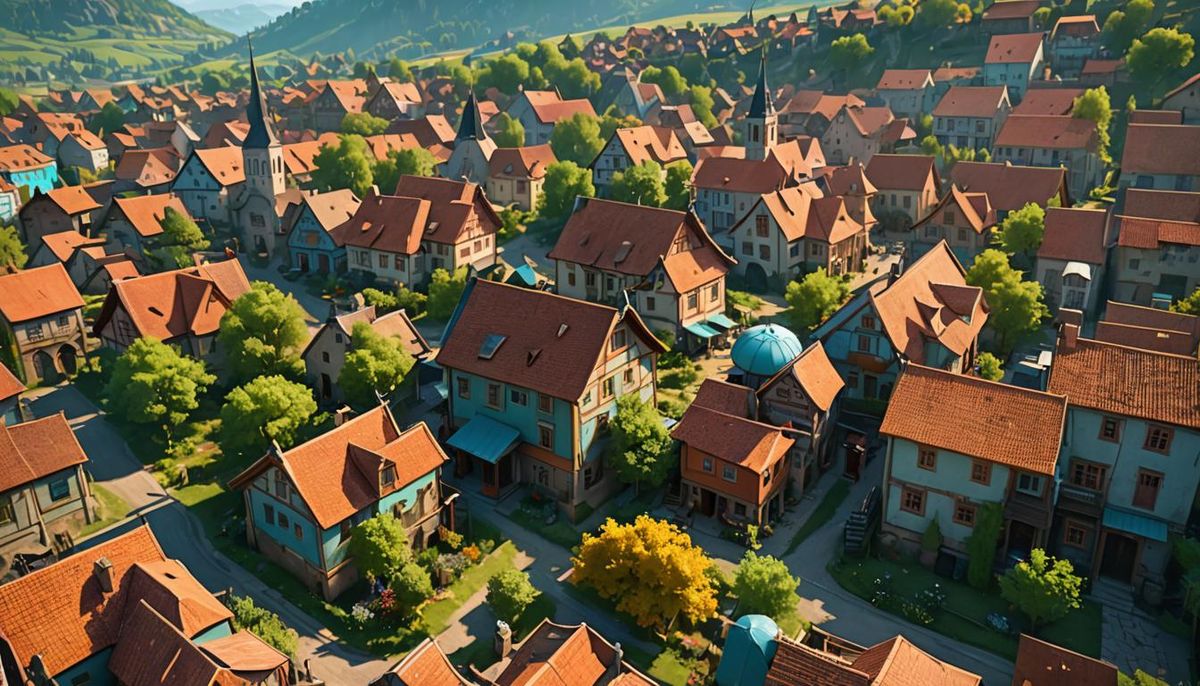 A vibrant image of a Hungarian village bathed in spring daylight. The scene is rendered with dynamic lighting, intricate details, and volumetric effects, as 8k resolution digital art.