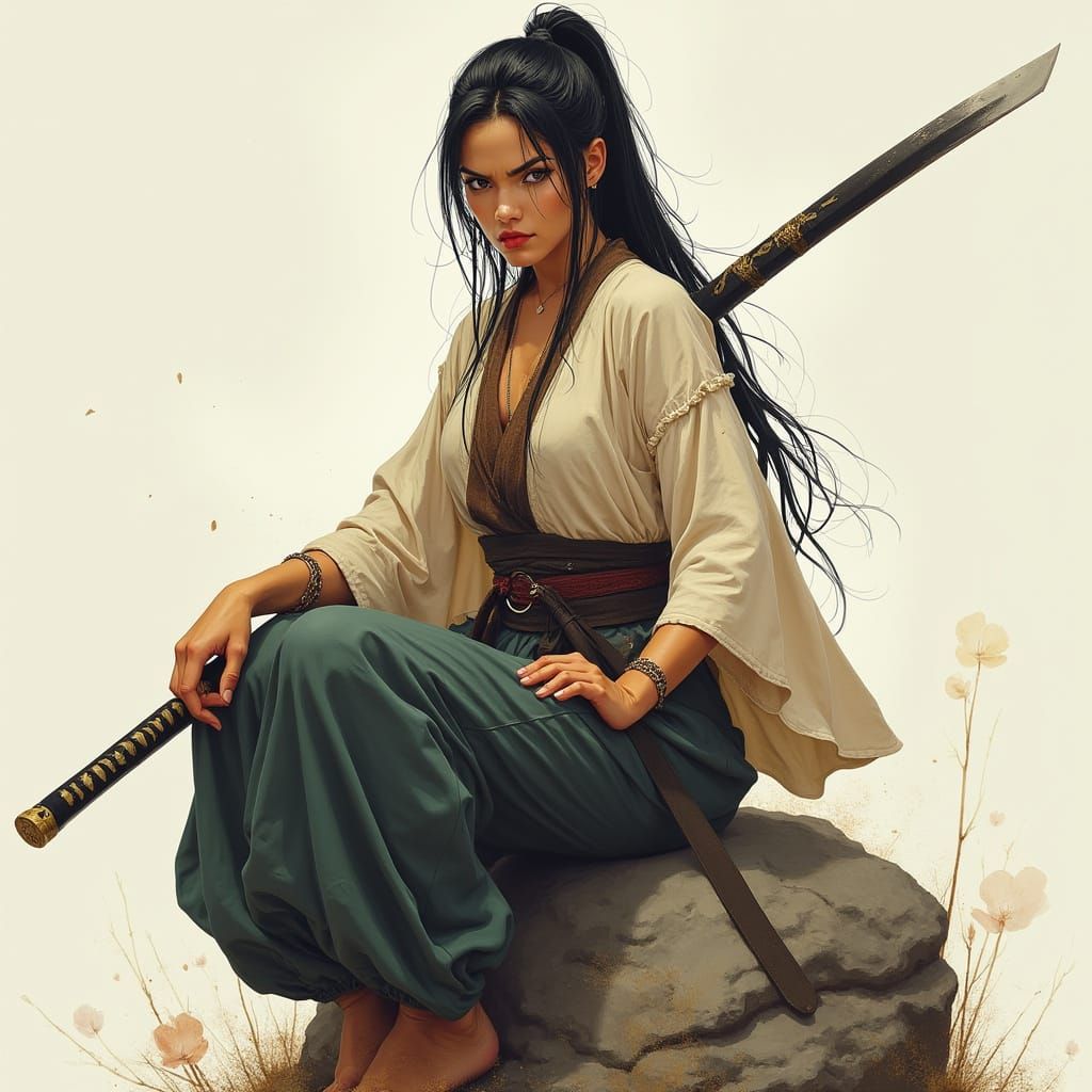 This image showcases a powerful female samurai warrior in traditional Japanese loose kimono and baggy pants, with a fierce expression and a long nodachi sword, set against a dramatic backdrop, blending traditional and digital art styles with intricate details.