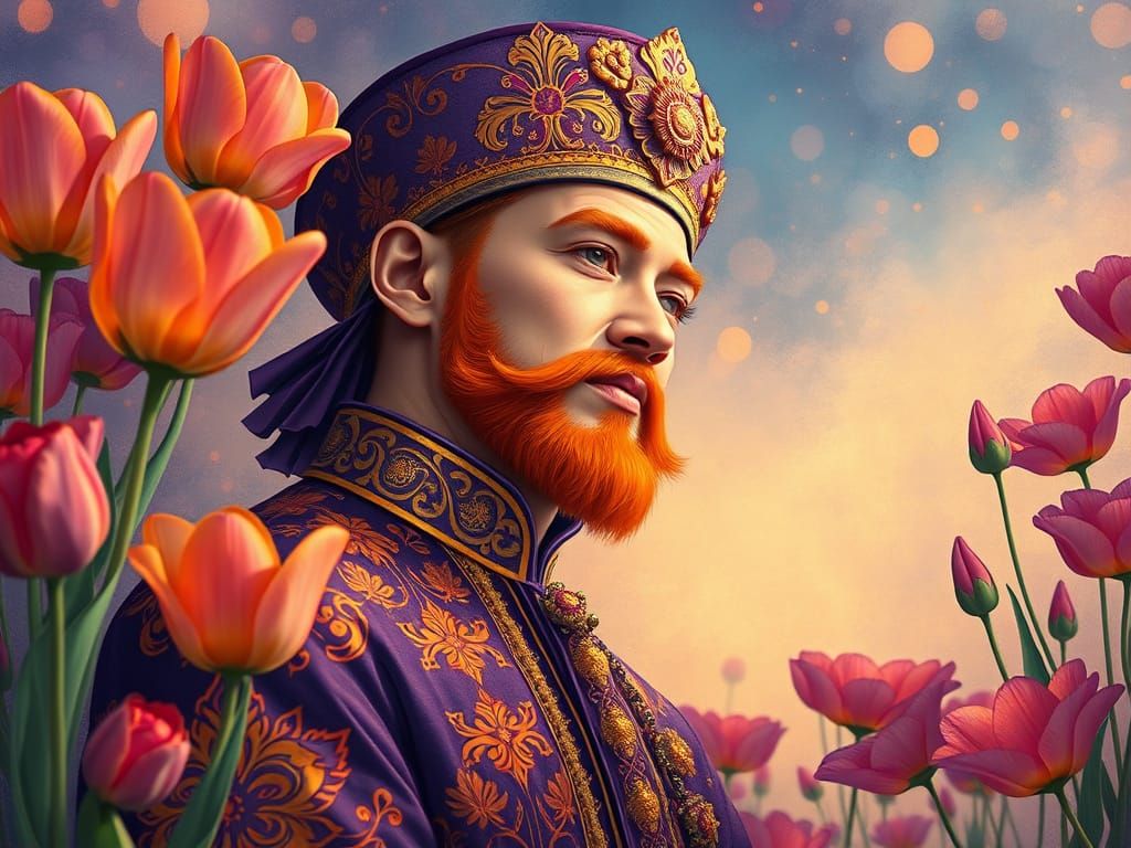 This enchanting image features a man surrounded by whispering purple and orange tulips, amidst a dreamlike atmosphere evoking the precision of botanical art and the vibrancy of Japanese colors, with intricate patterns and ethereal light.