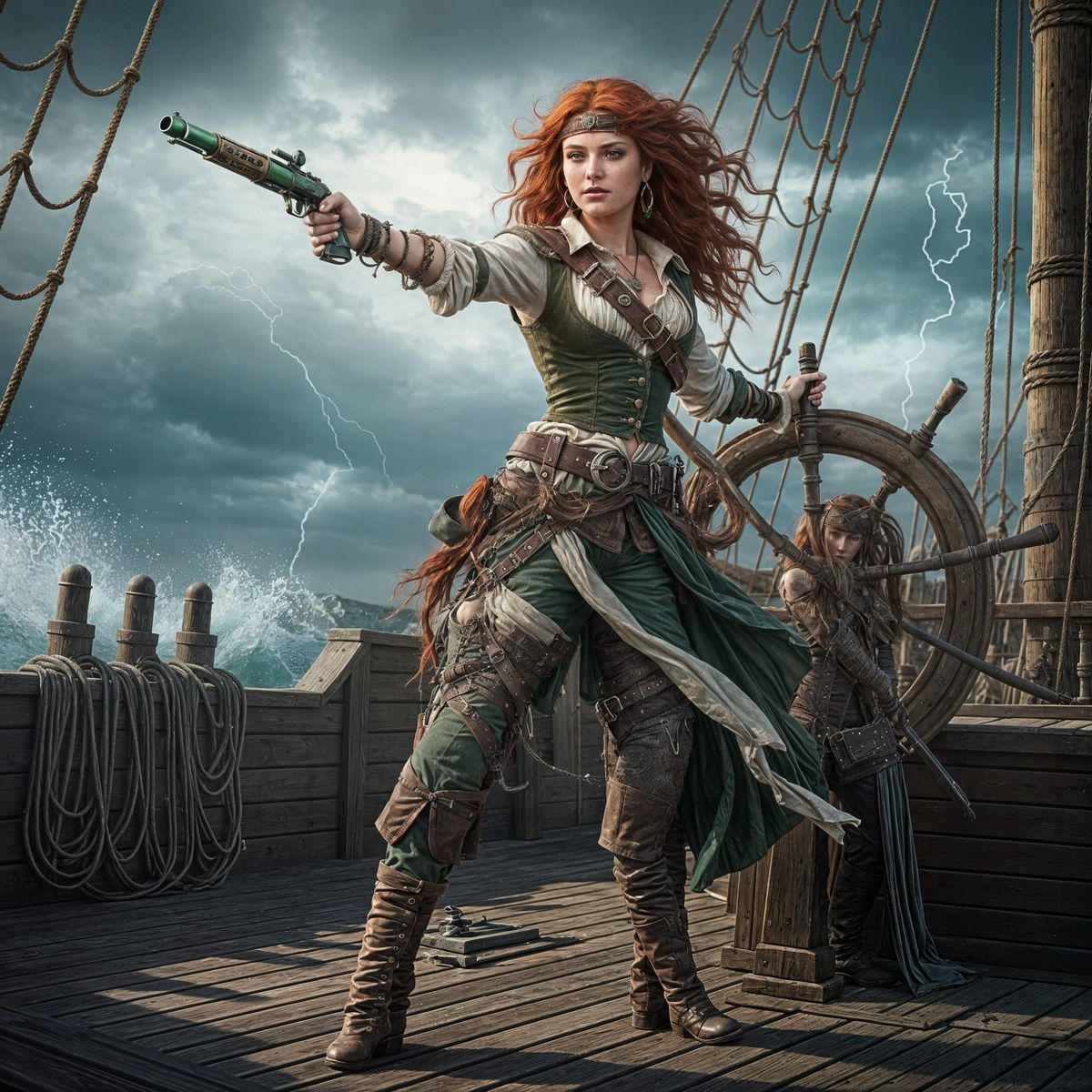 This image shows a fierce pirate queen with long red hair and green eyes standing on the deck of a ship, pistol drawn. The highly detailed image captures a commanding presence.