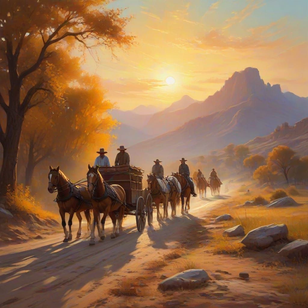 This image shows a group traveling in a horse-drawn wagon through an otherworldly landscape. The scene is rendered as an impressionist oil painting with vibrant colors and dynamic brushstrokes.