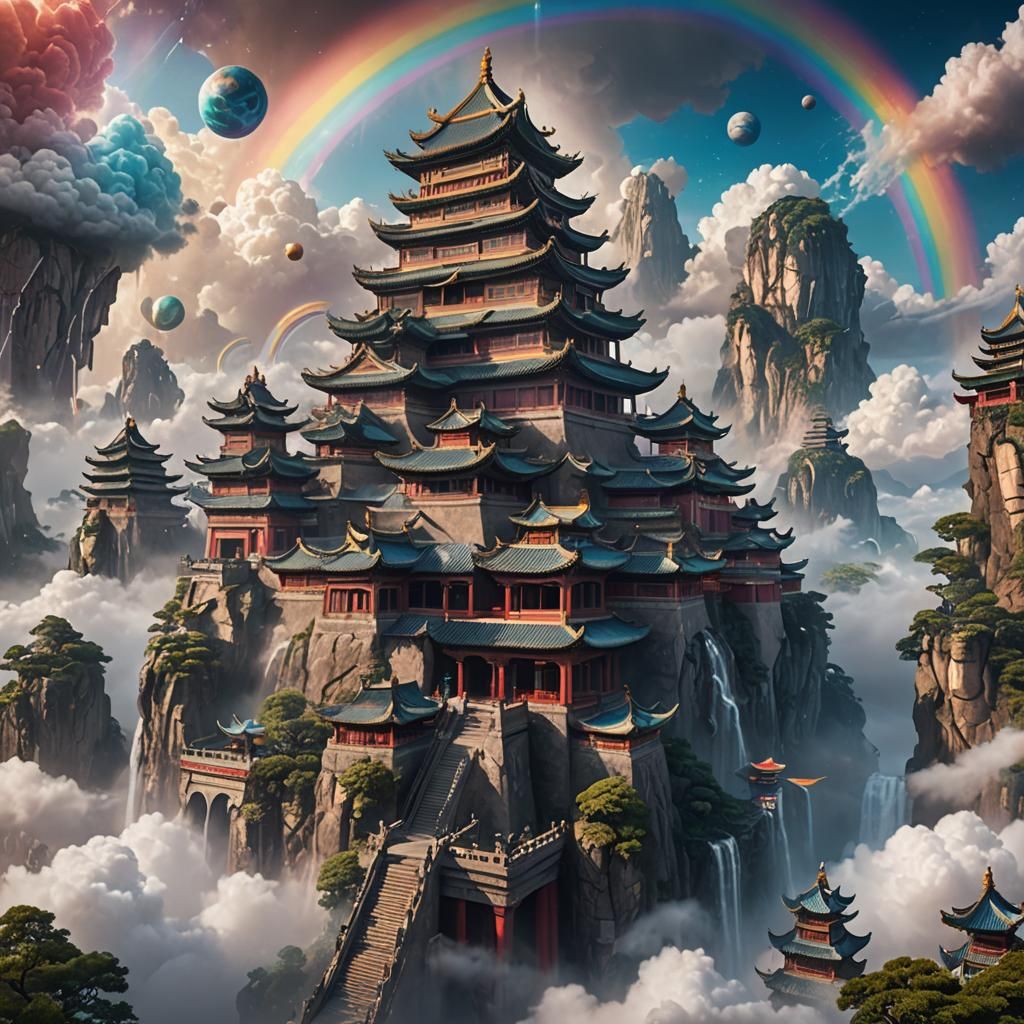 A fantastical digital painting of a Chinese palace floating amidst clouds, rainbows, and planets. The vivid colors and intricate details evoke a sense of wonder and fantasy in an 8K resolution.