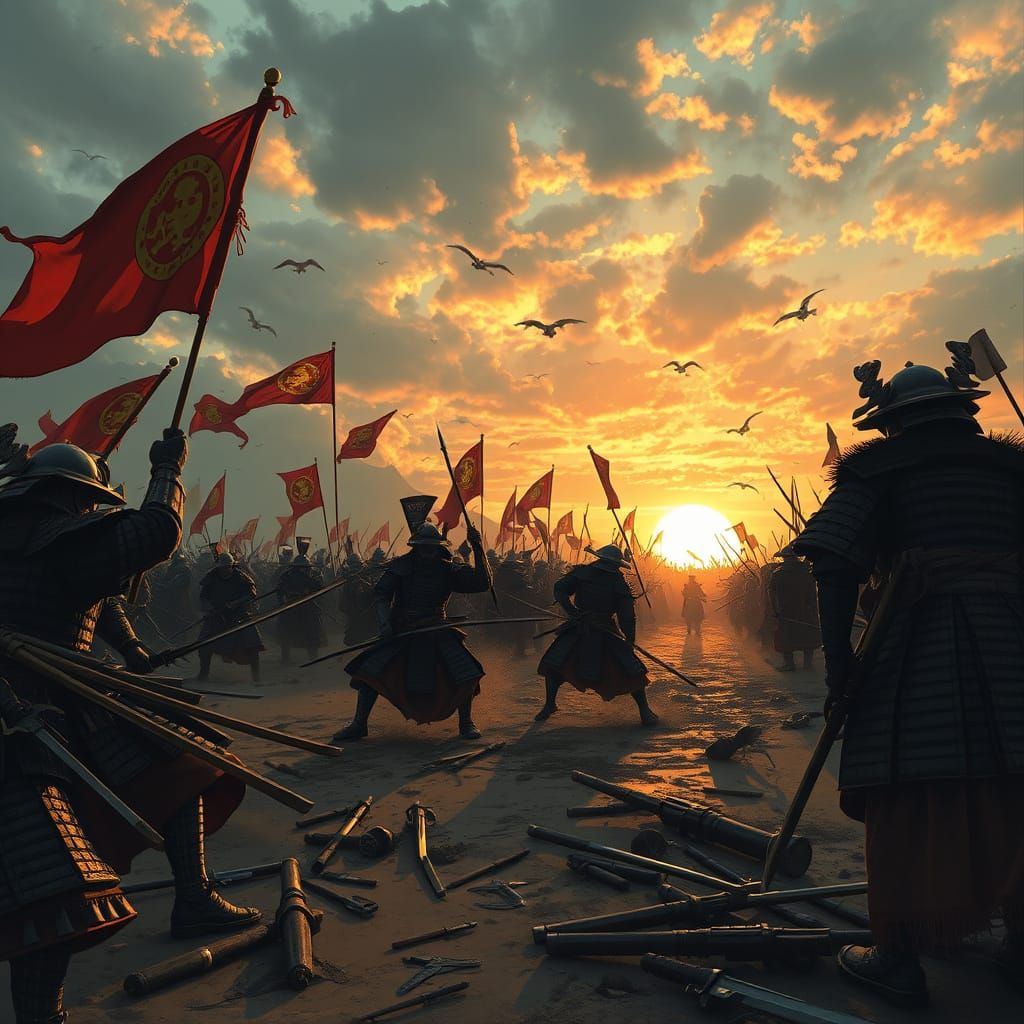 This image shows a chaotic and intense battle scene from the Battle of Sekigahara, with hundreds of samurai in traditional armor clashing on a vast, muddy battlefield at sunset. The dramatic lighting and hyper-realistic detail bring the scene to life, with banners waving and broken weapons scattered ever...