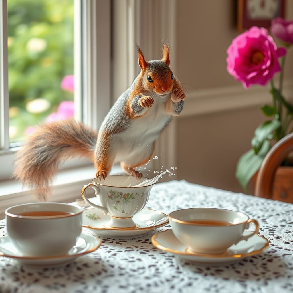 A mischievous squirrel has invaded a peaceful cottage kitchen, now caught mid-leap as it knocks over a full teacup while trying to steal a sugar cube. The tea splashes mid-air, and delicate china wobbles on a vintage lace tablecloth. Outside the window, a bright garden blooms.