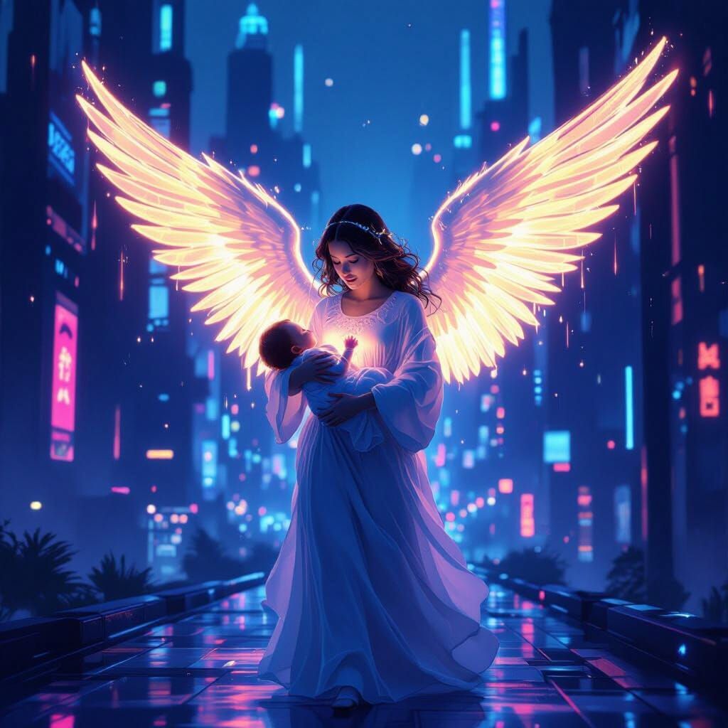 This image features a glowing angel with neon light wings holding an infant in a futuristic city at night. Rendered in vibrant digital art with dynamic highlights and electric blues and purples.