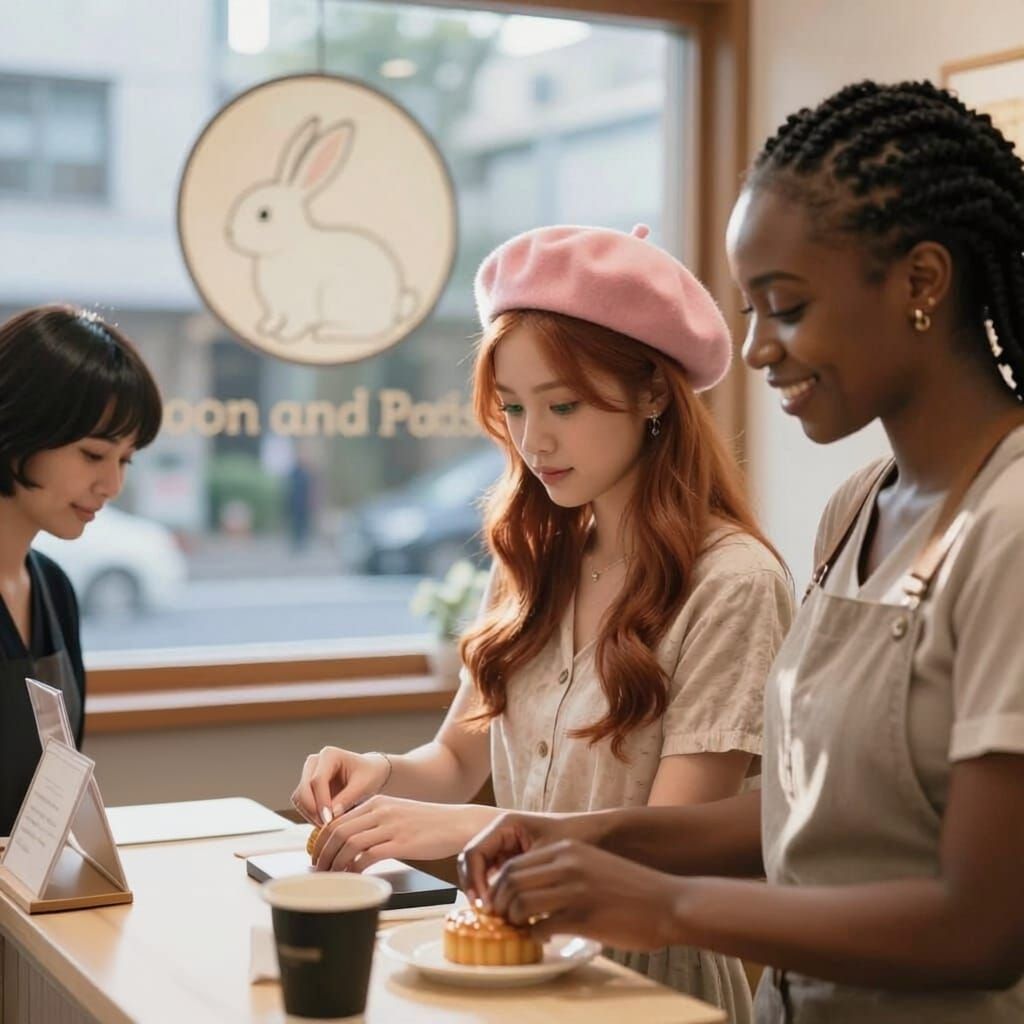 This image shows three women of diverse backgrounds closing a Tokyo patisserie. They count the register and clean counters in soft evening light, conveying a sense of quiet happiness and achievement. Captured in ultra high definition with bokeh and natural lighting.