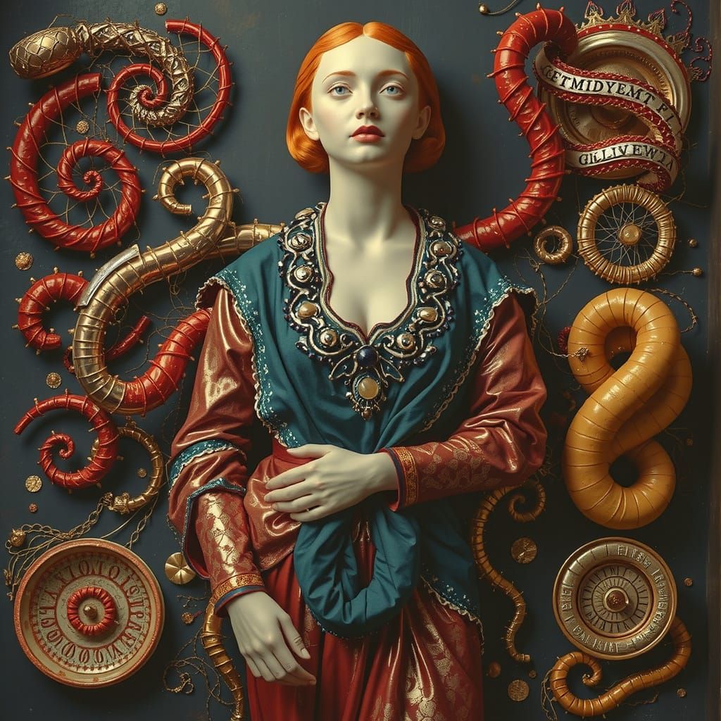 A striking picture of an elaborate sculpture featuring red, white, gold, and black elements. The artwork uses dramatic lighting and a cinematic backdrop to enhance its complex, chaotic textures.