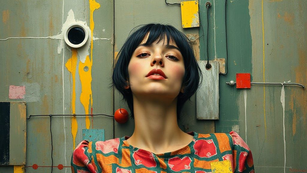 This image showcases an abstract aesthetic generated by AI. The image reflects an artistic style characterized by bold colors and industrial elements, creating a visually striking composition.