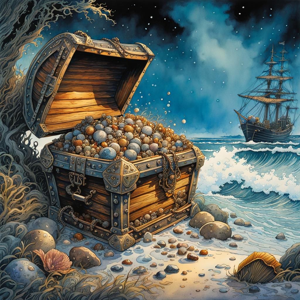 A dynamic watercolor painting of a barnacle-covered treasure chest on a beach after a storm. The image is highly detailed with ink accents and soft, vivid colors.