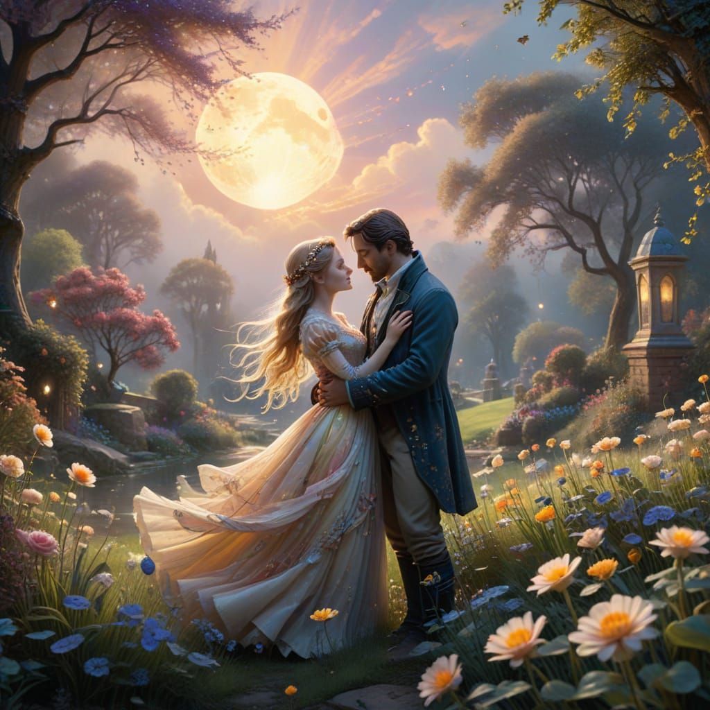 This enchanting watercolor painting depicts the moon and sun in a romantic, dreamy pose amidst an eternal sunshine landscape. Soft, feathery brushstrokes and vibrant, pastel colors create a whimsical, ethereal atmosphere.