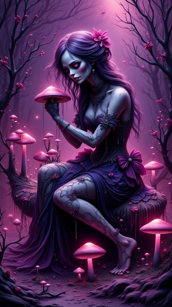 This image shows a gothic punk woman on a glowing mushroom, with the Grim Reaper feeding her. Features neon smoke and a white rabbit in a glossy cartoon style.