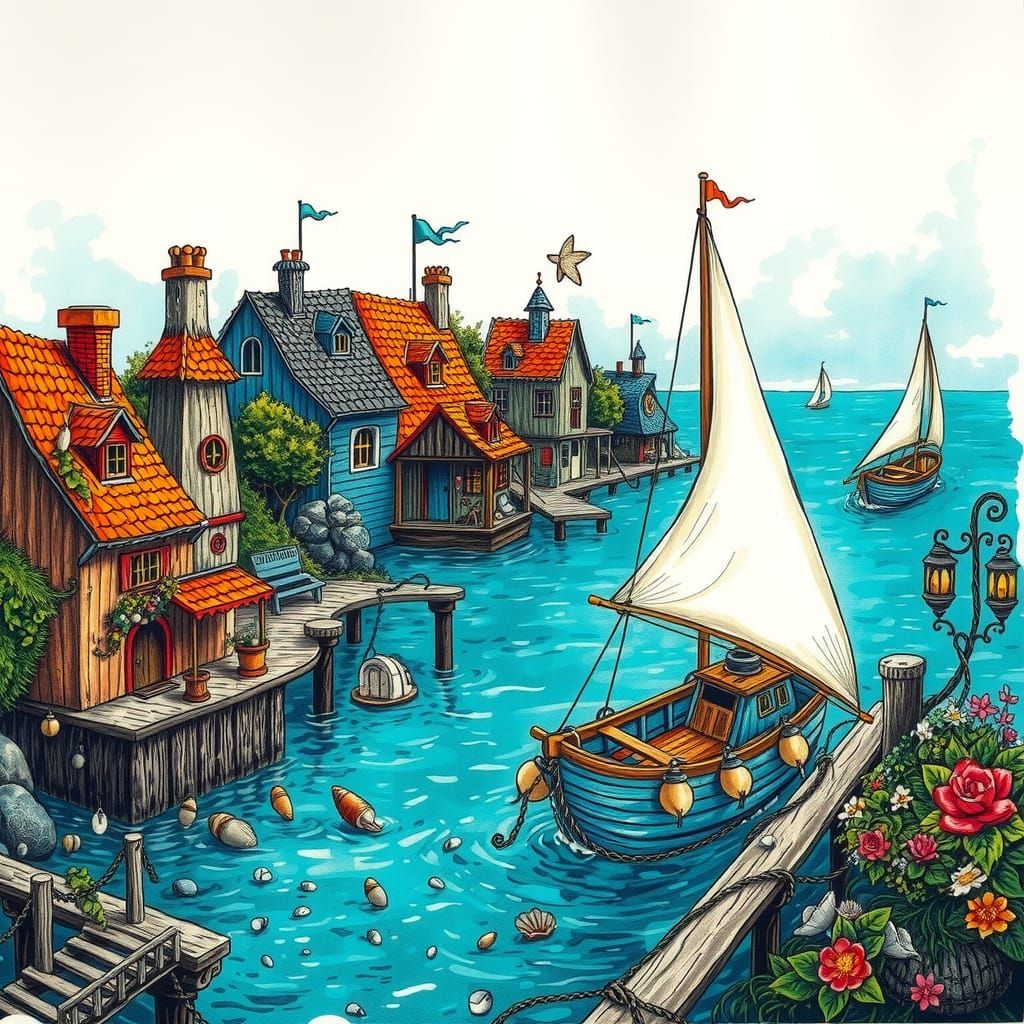 This enchanting image depicts a quaint fairytale village surrounded by a dock, where fishing boats with intricate details bob gently on shimmering turquoise water, amidst a tangle of fishnets, lanterns, and blooming florals, all rendered in bold pen and ink lines and vivid color, evoking a fantastical, d...