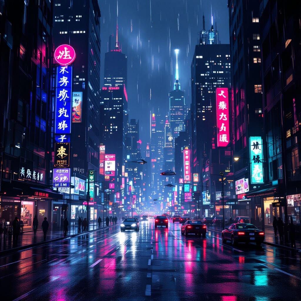 This image depicts a sprawling, futuristic city at night during a heavy rain. Neon lights reflect on wet streets, with flying vehicles creating light trails in a moody, cinematic style.