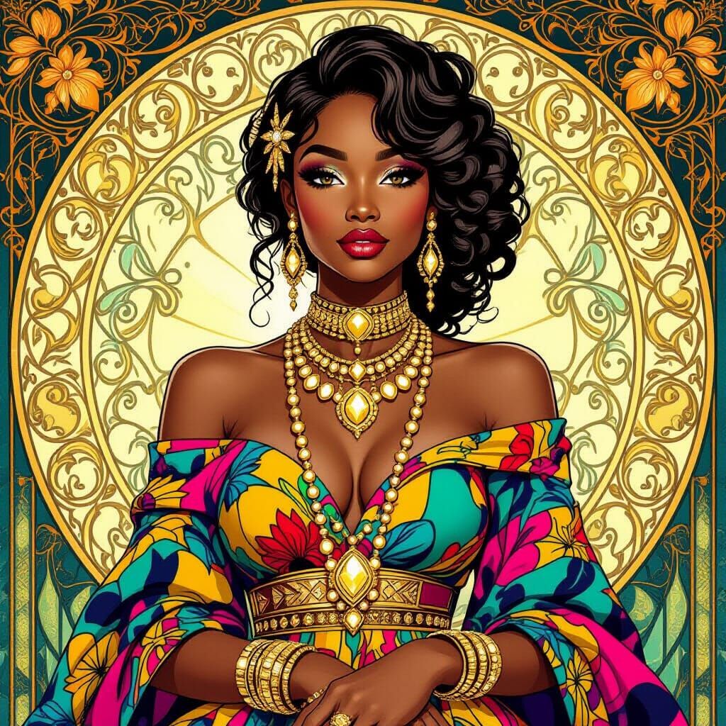 This image shows an African American woman in a vibrant Ankara dress and gold jewelry. The artwork is in an elegant, dreamy style with fancy details, reminiscent of Art Nouveau posters.