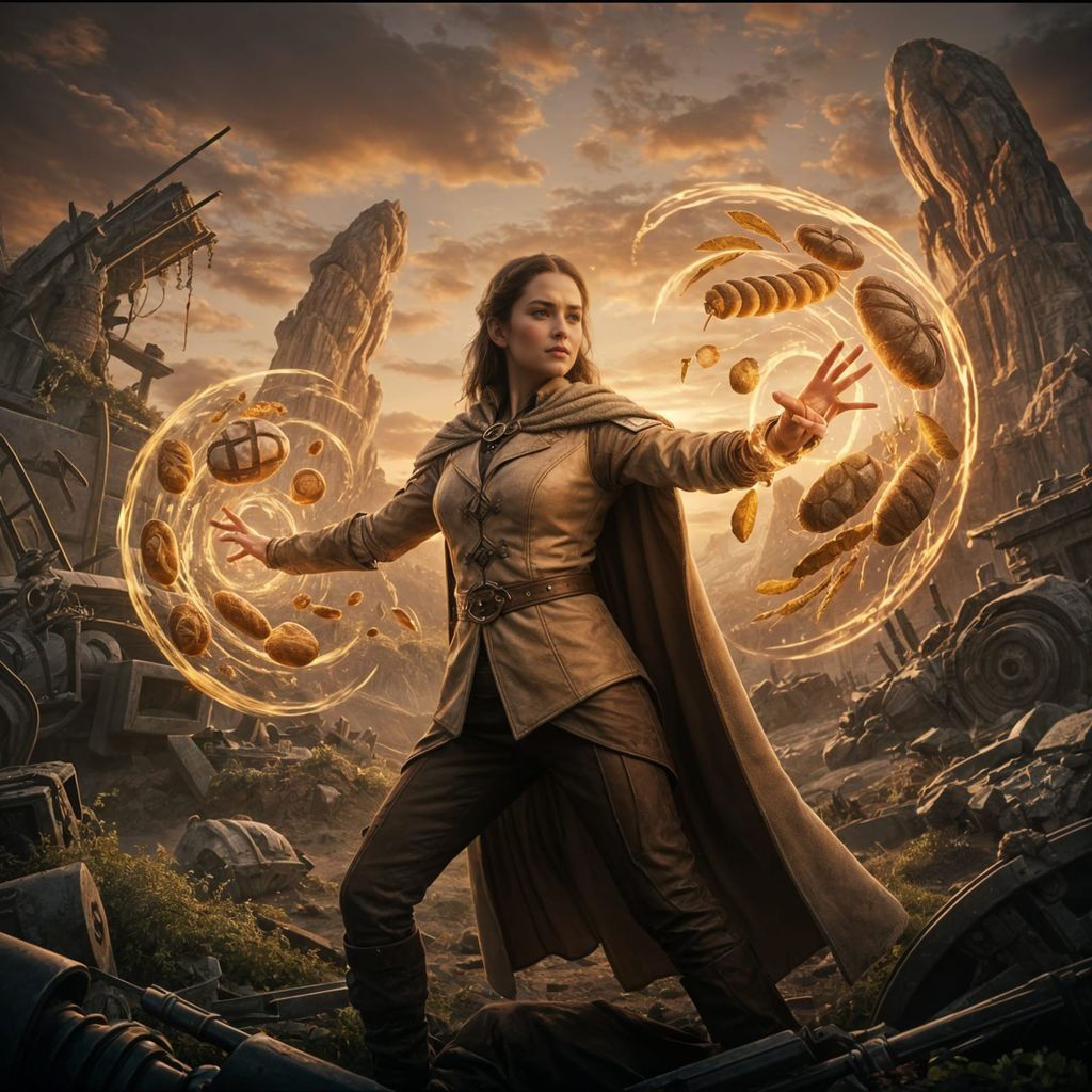 "High fantasy epic female bard of the college of Bread, light tan jacket, bread magics, scenic background, high detail, high quality, correct anatomy, Cinematic film still, shot on v-raptor XL, film grain, vignette, color graded, post-processed, cinematic lighting, 35mm film, live-action, best quality, atmospheric, a masterpiece, epic, stunning, dramatic"