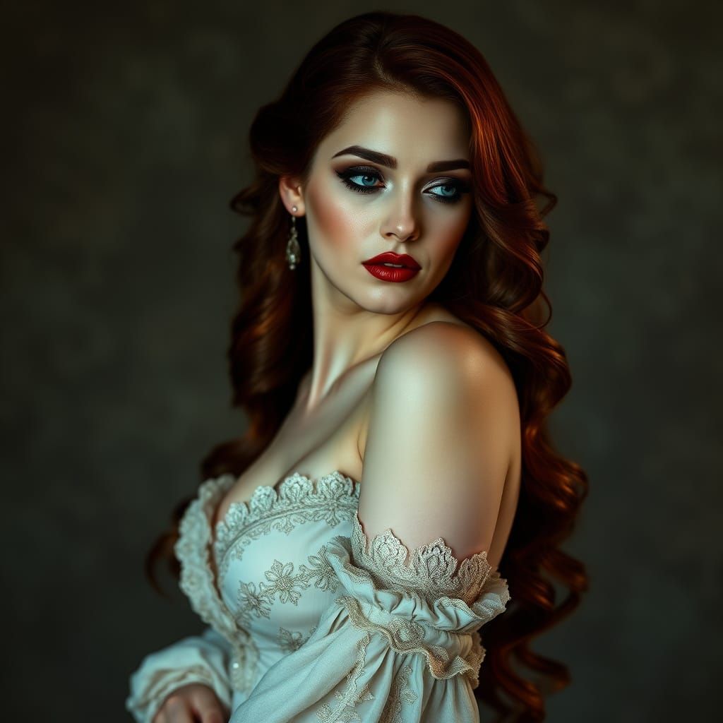 This image shows a stunning French-Creole woman with auburn hair and porcelain skin, evoking the moody, introspective style of the Pre-Raphaelite era with hints of Southern Gothic charm