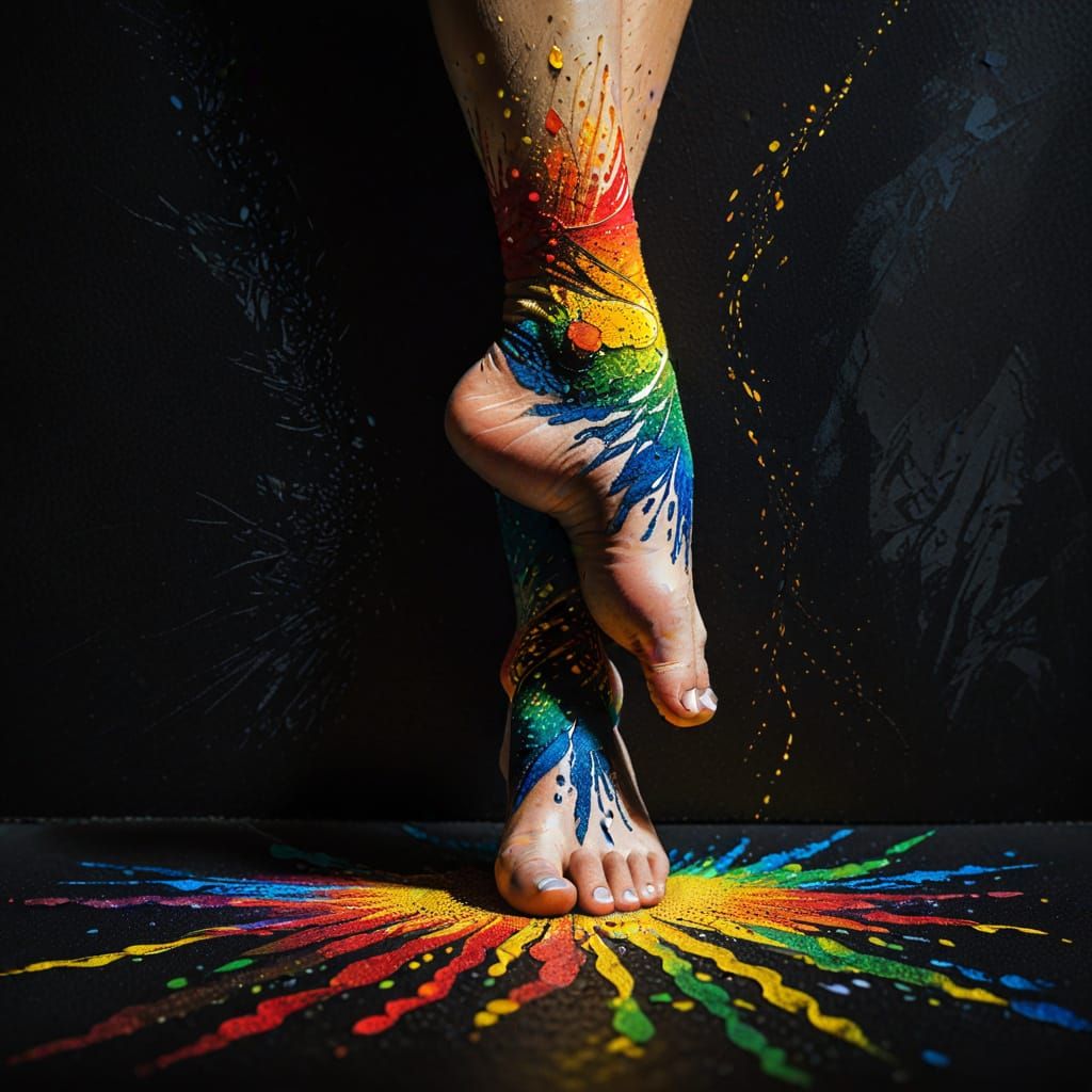This image shows a silhouetted dancer with bare feet standing against a black backdrop. The artwork features pointillist and pyrography techniques, vibrant ink colors, and white hatchings.