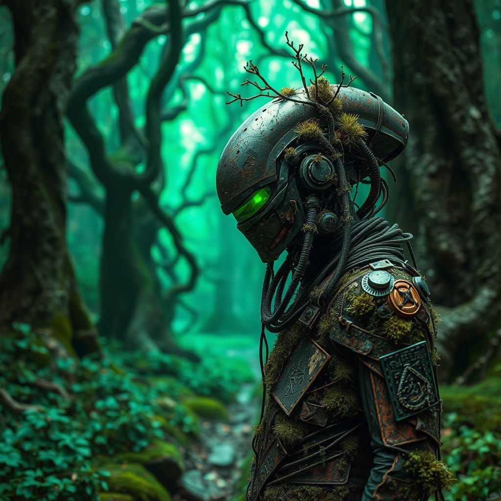 This image showcases a hyper-detailed, high-contrast scene of a grunge outfit crafted from living moss and weathered metal, set against a dystopian forest backdrop, evoking the dark, biomechanical style of H.R. Giger and the avant-garde silhouettes of Alexander McQueen, with intricate textures and an eer...