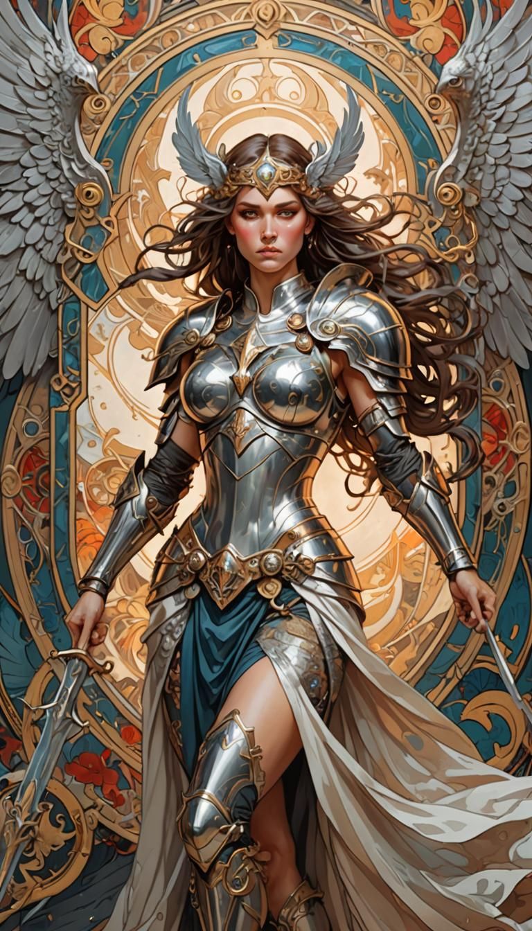 A fierce Nordic Valkyrie, clad in silver armor. Her presence is shrouded in mystery, embodying symbols of war, fate, and choice.