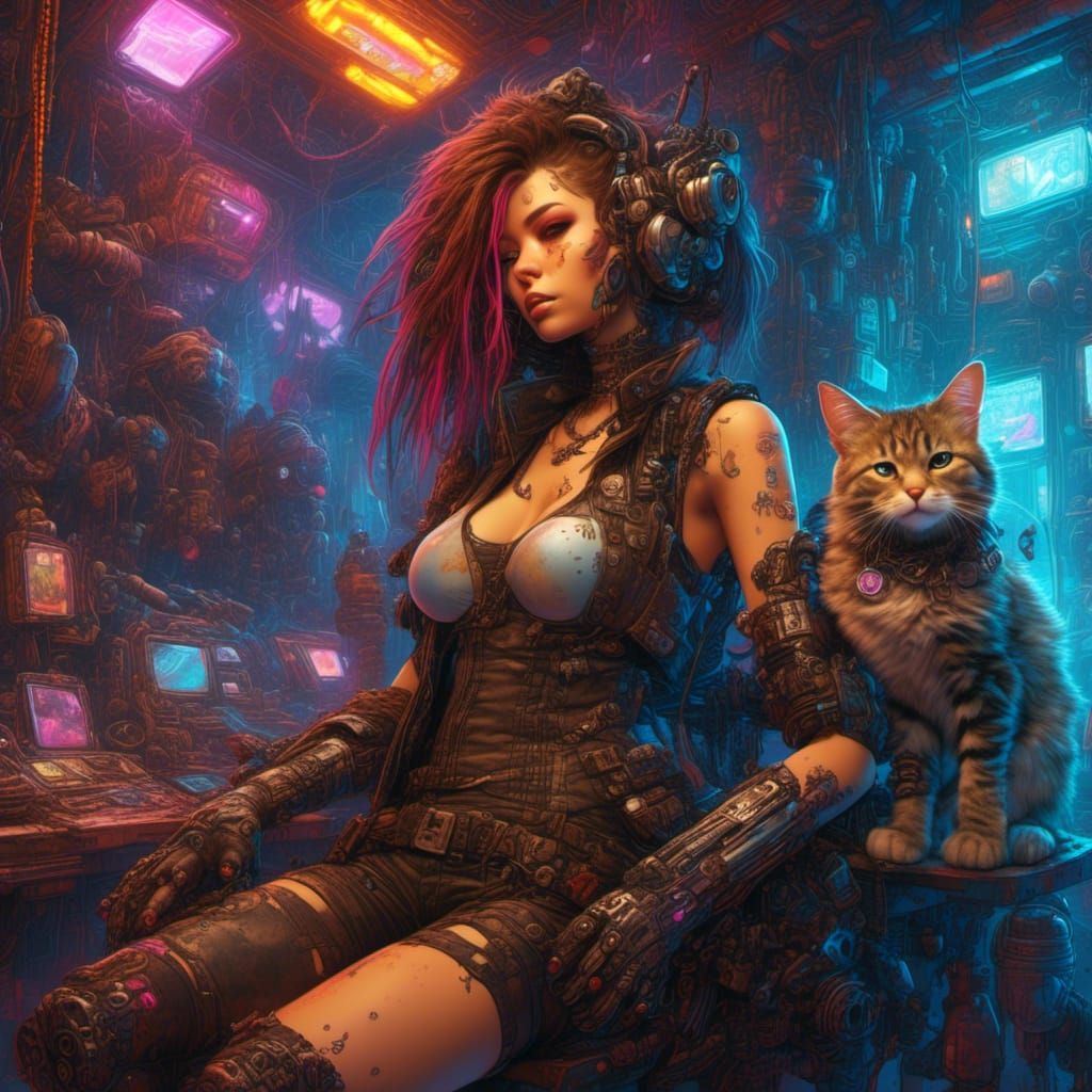 This image shows a very fluffy cyborg cat with a hairy body. The art style is hyperrealist, with a cyberpunk aesthetic.