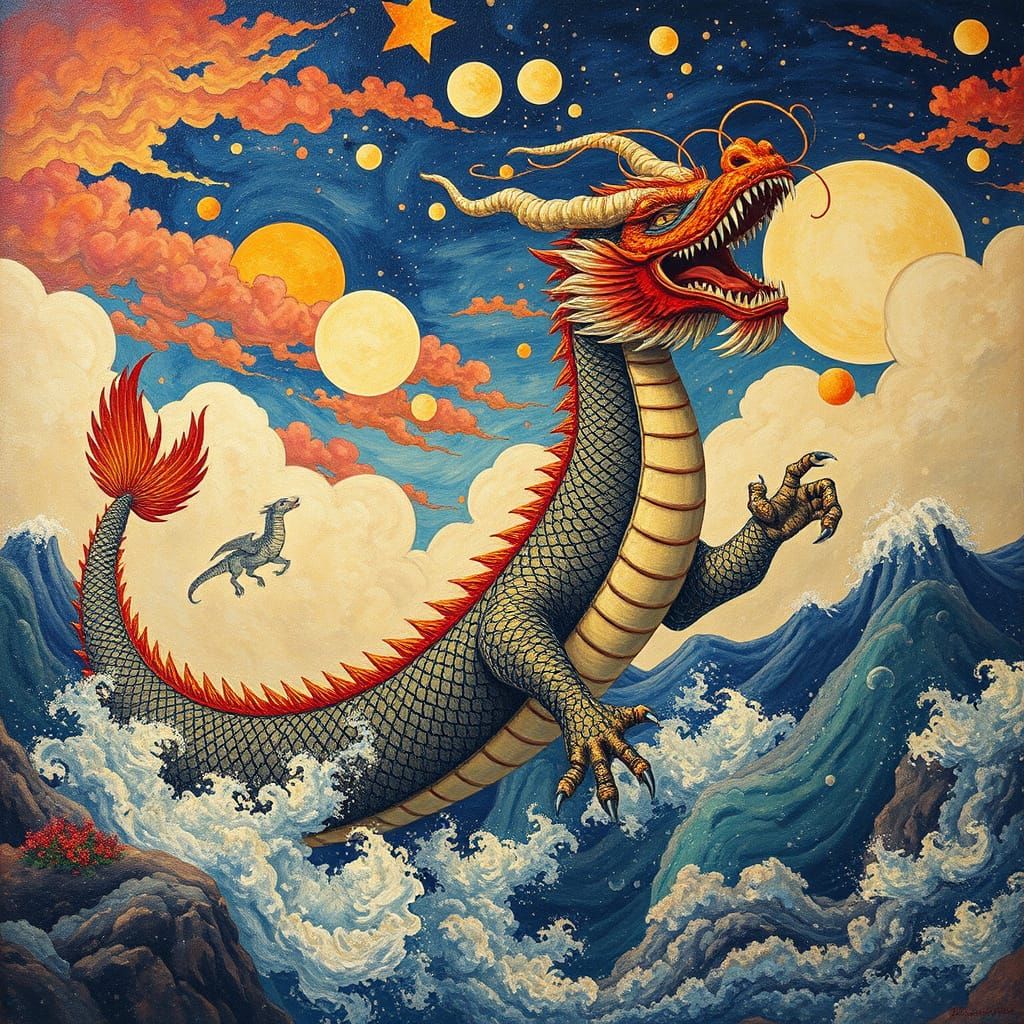 This image shows a pin-up figure chasing a giant Japanese dragon. The image is rendered in a pointillist style, reminiscent of classic oil paintings.