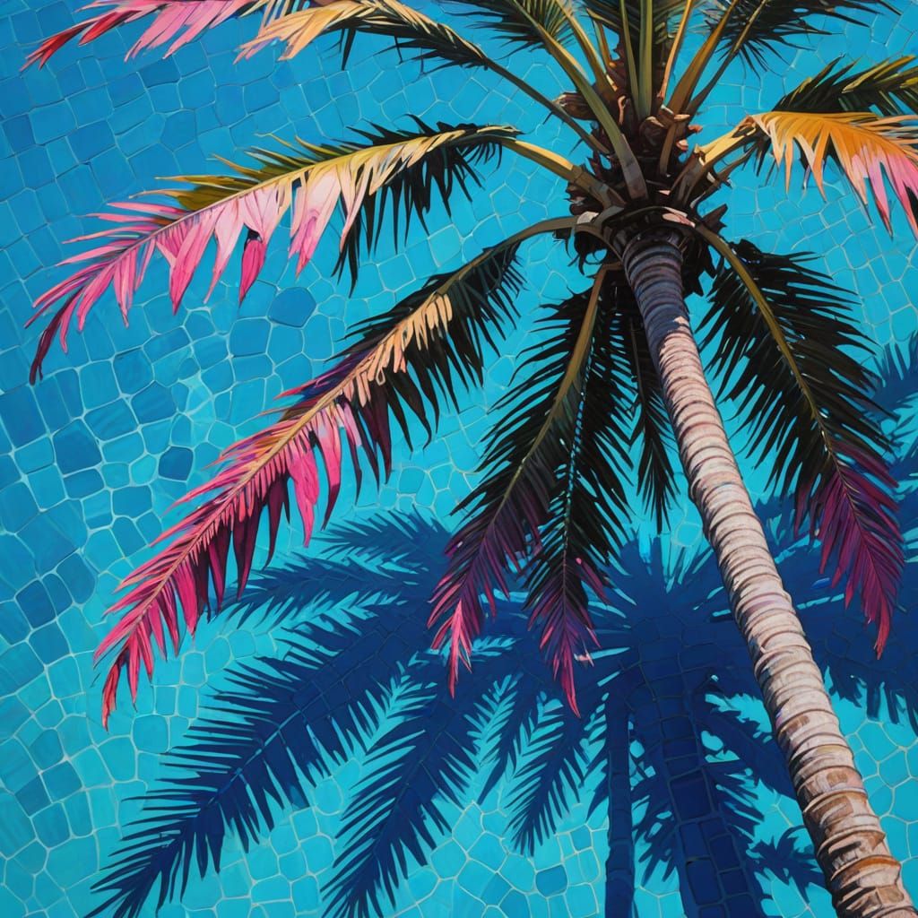 This image shows a close-up of a palm tree standing by a blue pool, set against a warm and vibrant background of ultramarine, mint, and pink hues, with neon accents and soft brushstrokes, creating a striking modern decorative art piece.