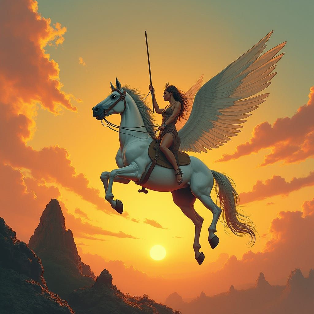 This image depicts a regal fairy queen astride a majestic pegasus, set against a backdrop of warm, golden sunset hues reminiscent of classic comic book art.