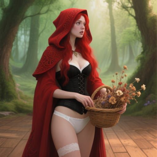 A striking picture of a woman in a red hooded cloak and black corset, holding dried flowers. This photorealistic digital painting showcases a fairy tale aesthetic with expressive features and a serene forest backdrop.