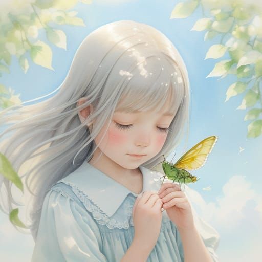 A soft focus watercolor illustration of a little girl's hand cradling a cute grasshopper, surrounded by fluffy clouds and warm sunshine, evoking a sense of childlike innocence and gentle playfulness.