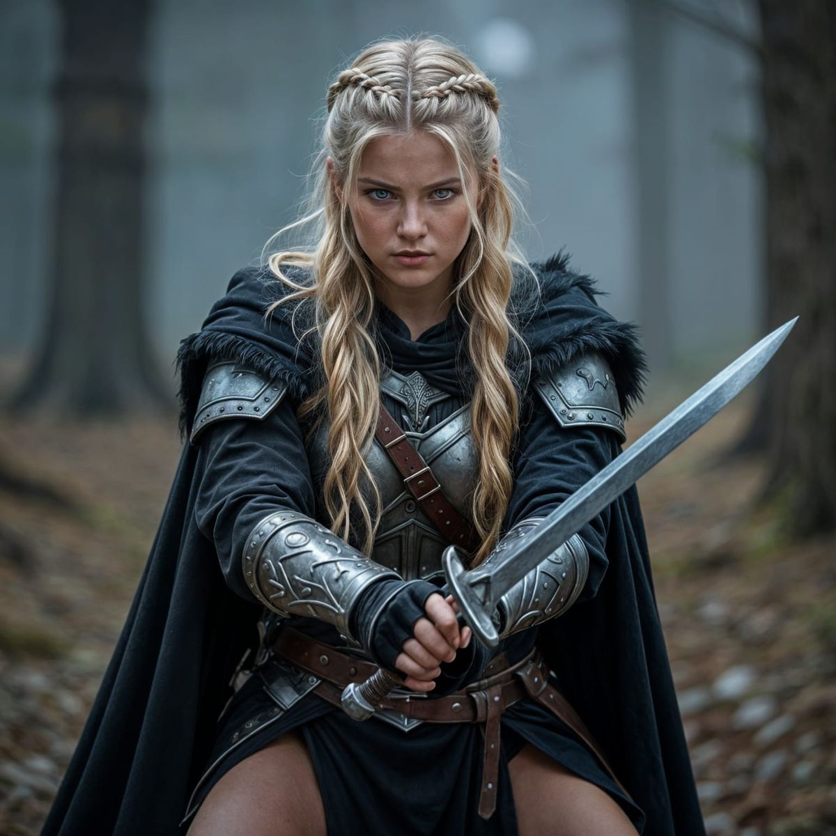 This image shows a young, determined Viking woman in steel armor and flowing robes, wielding twin daggers. Photorealistic detail captures her fierce expression and ice blue eyes.