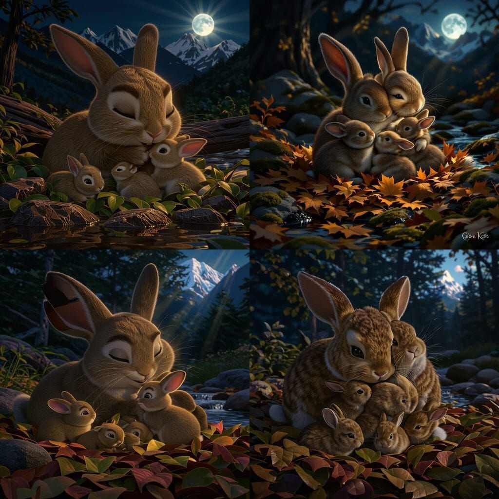 This image shows a highly detailed CGI scene of a mother rabbit waking and snuggling her baby bunnies amidst leaves. Morning sun illuminates a distant snowy mountain range and a clear stream.