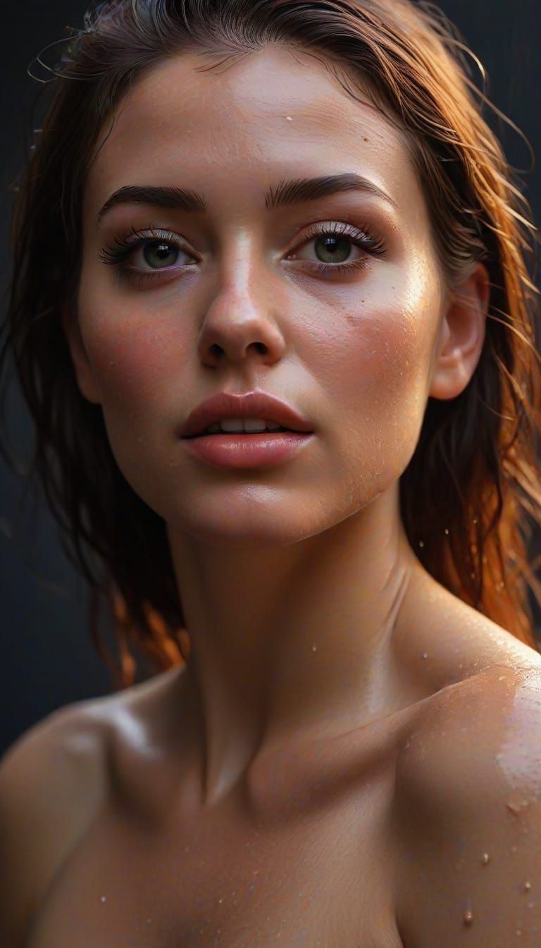 This image is a stunning oil painting of a woman kneeling in the rain, her head tilted back as she gazes up at the sky. Soft, golden light illuminates her skin, and water droplets cling to her eyelashes and freckles, creating a captivating scene in a style reminiscent of Gil Elvgren's masterpieces.