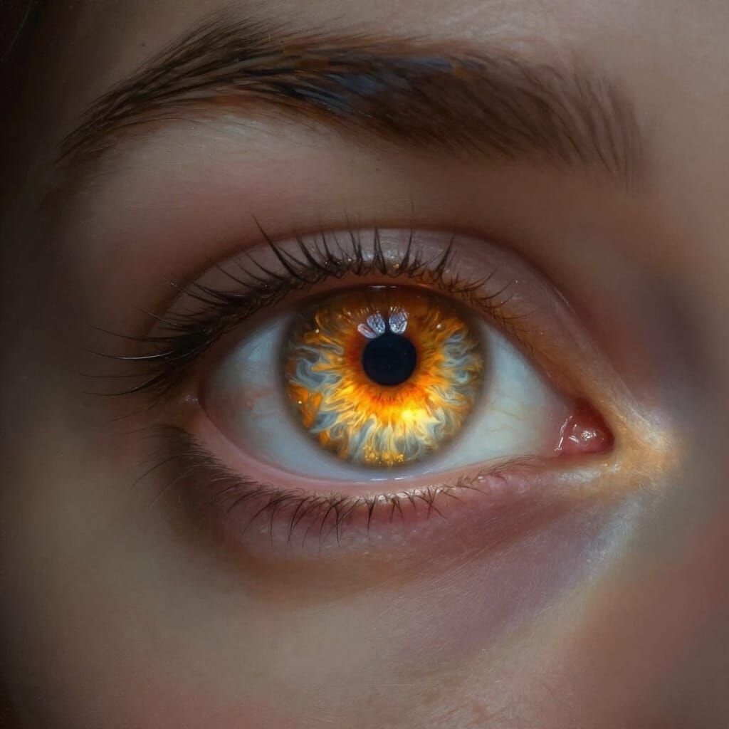 This hyperrealistic digital painting captures a close-up of an extraordinary eye. It features a luminous golden iris and a striking pupil of red and grey, with dramatic lighting and a shallow depth of field.