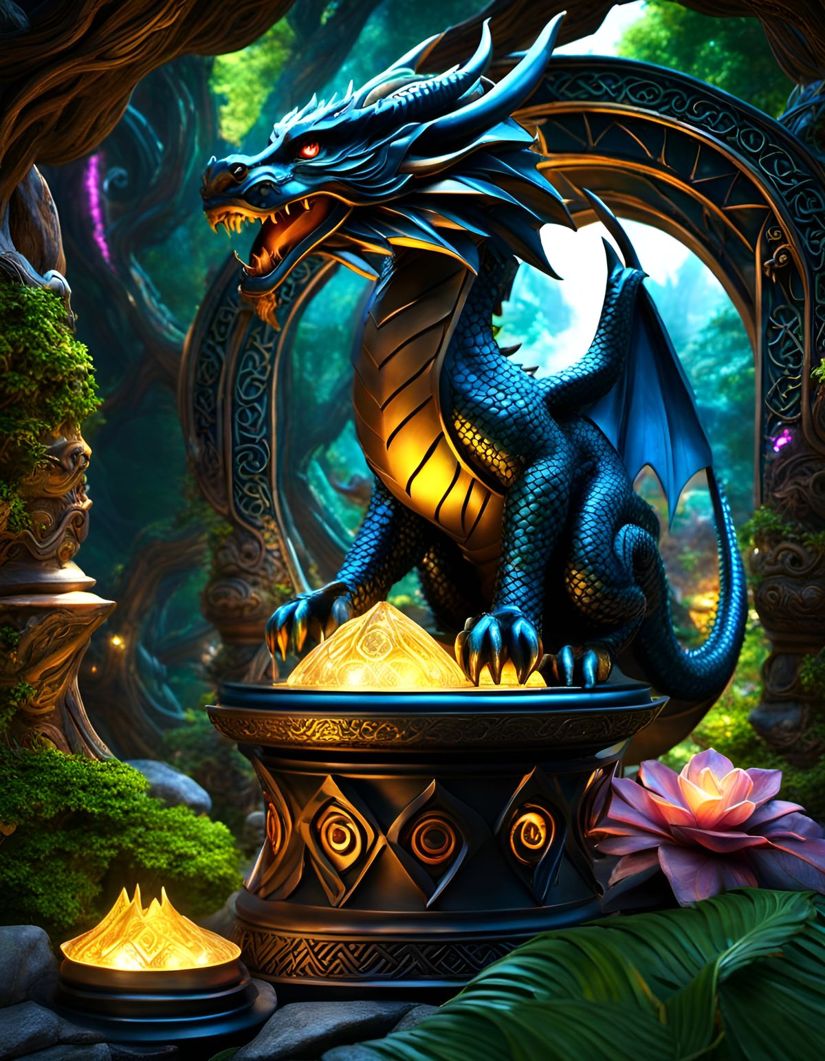 A detailed image of a crystal dragon temple, built as a shrine for a dragon sect. Celtic symbols, sacred geometry, fractals, and optical illusions create a vibrant, layered 3D effect.