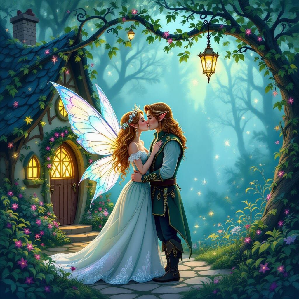 A romantic illustration captures a fairy princess and elven prince kissing under mistletoe before their magical cottage. Rendered in a dreamlike, illustrative style with soft lighting and jewel tones.