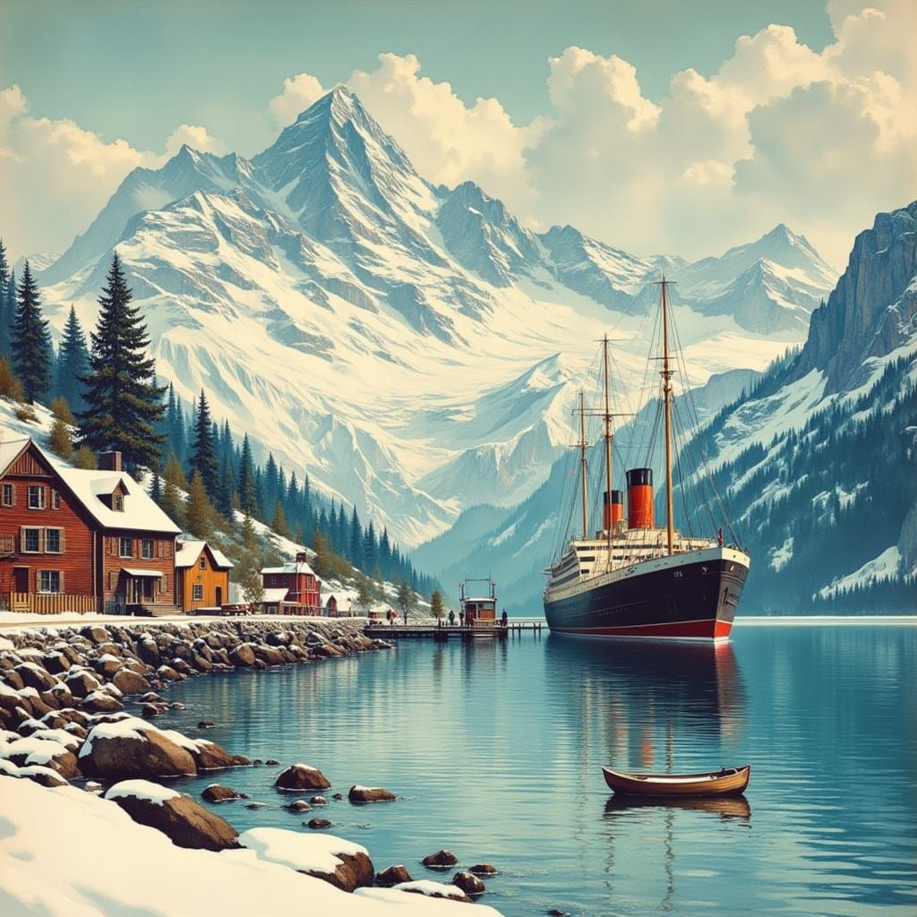 This image captures a nostalgic 1930s-1940s travel poster featuring majestic, snow-covered mountains, a vintage steamship, and charming harbor buildings, all rendered in a painterly, retro style with muted colors.