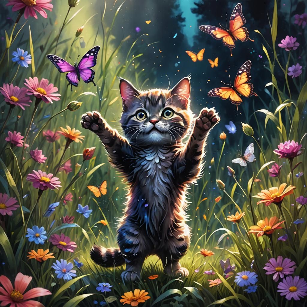 A watercolor painting of a cat standing on its hind legs, attempting to capture a glowing butterfly among vibrant grass and flowers. This dark fantasy concept art features dynamic, volumetric lighting.
