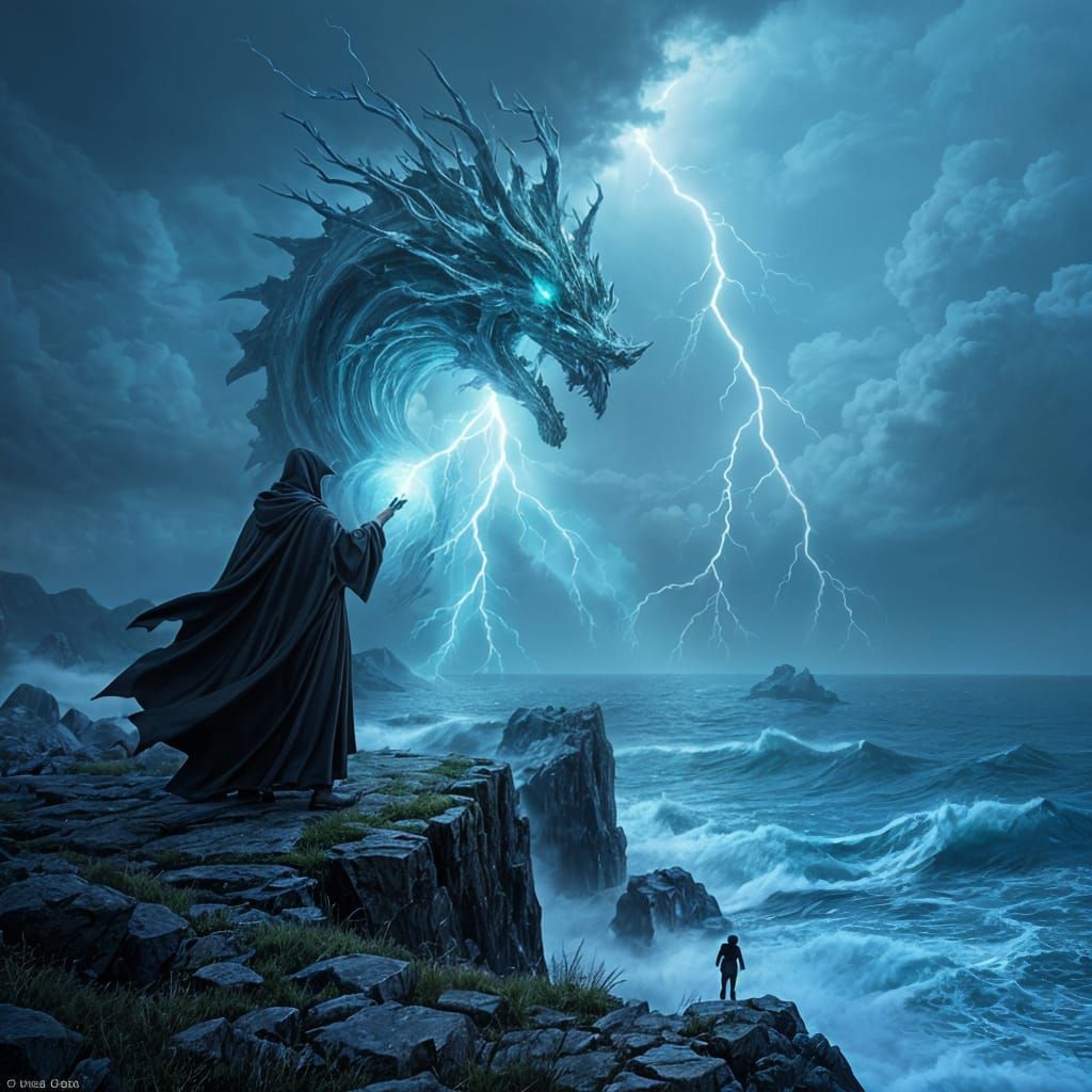 A solitary witch iin a hooded cloak stands on a windswept cliff overlooking a stormy sea, casting a spell with glowing runes. The sky above ...