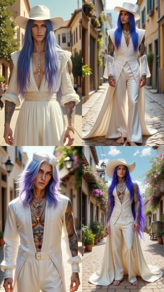 This image shows a tall, muscular groom with long blue-purple hair, adorned with tattoos, posing barefoot in a Spanish village on their wedding day. The artwork is a photorealistic masterpiece with intricate details.