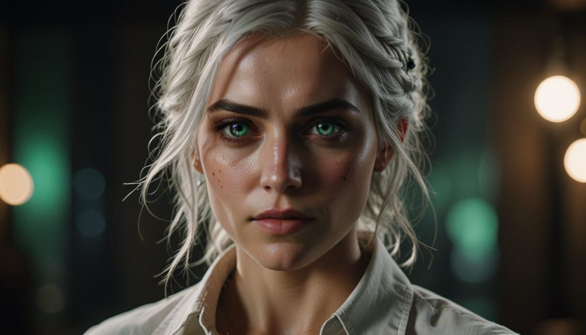This image is a captivating, highly detailed portrait of a young woman with emerald green eyes, set against a soft, blurred background. The photorealistic style captures the subtleties of her features and the texture of her clothing with stunning realism.