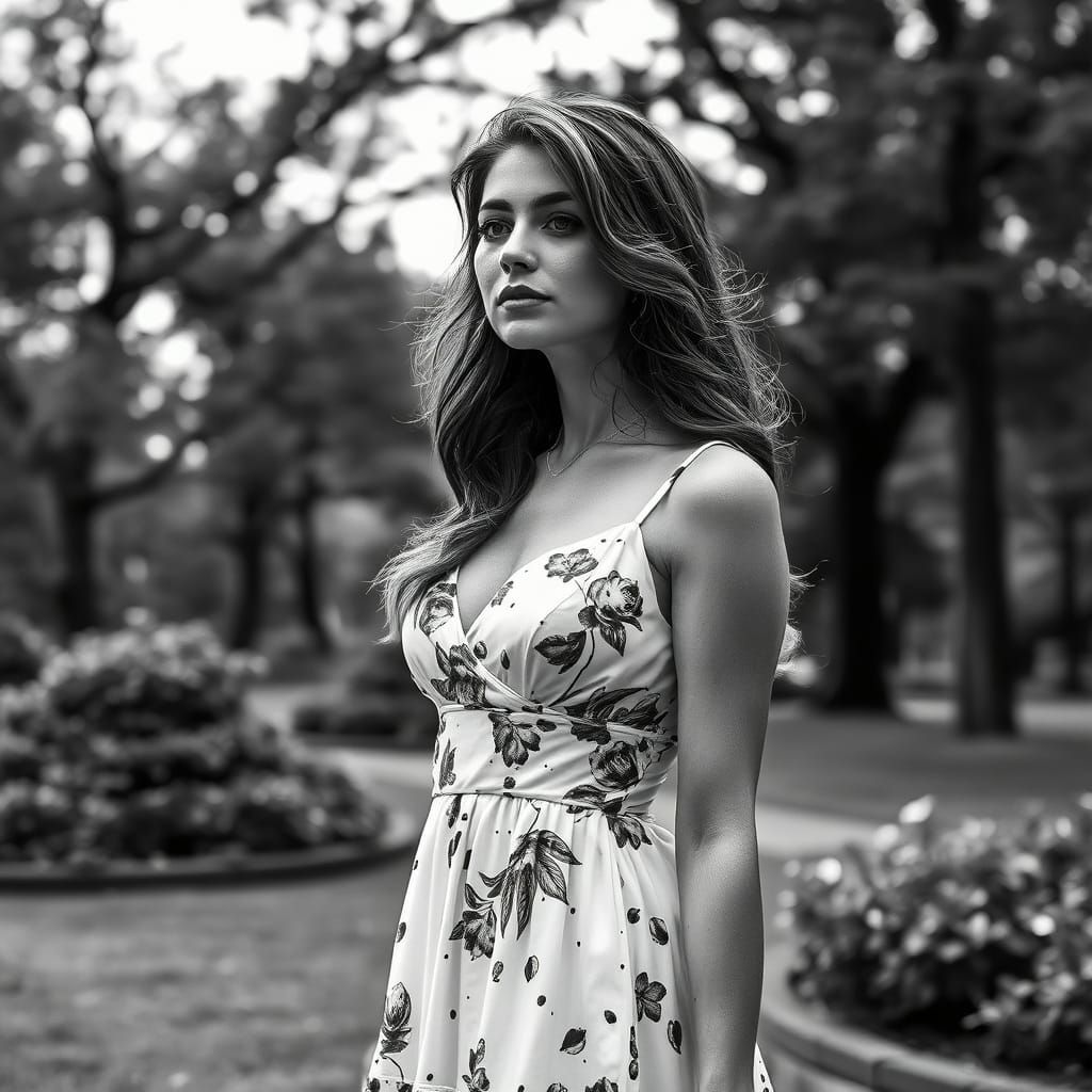 This image shows an elegant woman in a summer dress, captured in black and white. The image features intricate details and high contrast, rendered in an alcohol ink splatter style.