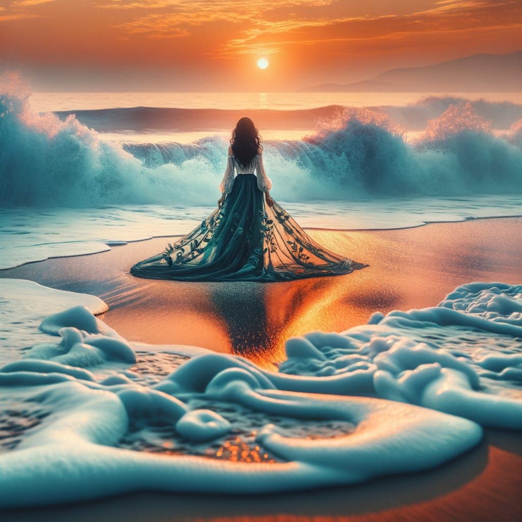 A breathtaking HDR image of a stunning woman standing on a beach, surrounded by wet seafoam waves at sunset, her dress mirroring the misty, swirling waters. Rendered in UHD with intricate details and a captivating, unique style, this image embodies the golden ratio.