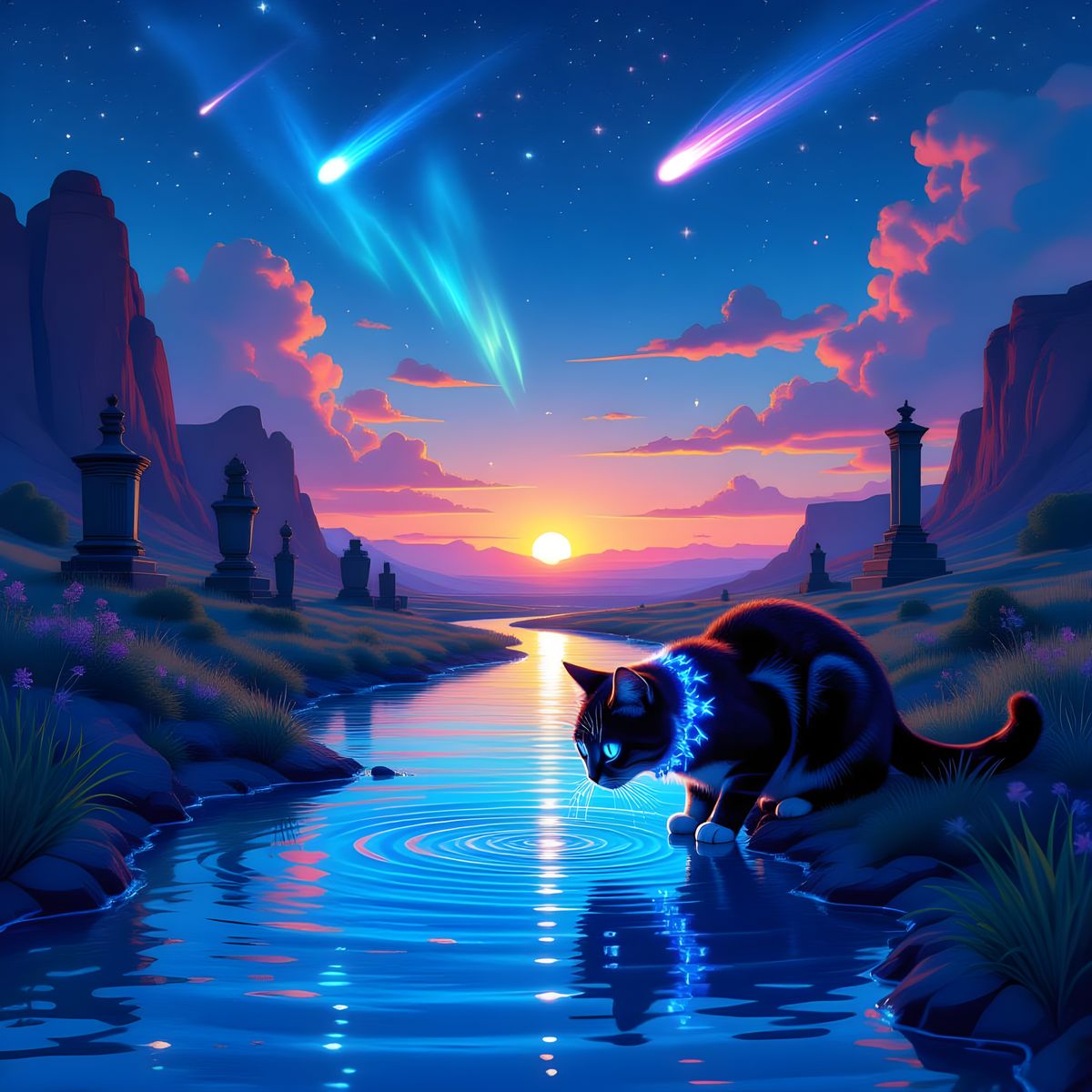 This image shows a vibrant blue river reflecting a cosmic sunset. The sky is filled with stars and auroras, while a cat with matching eyes drinks from the water. Hyper-detailed and cinematic.
