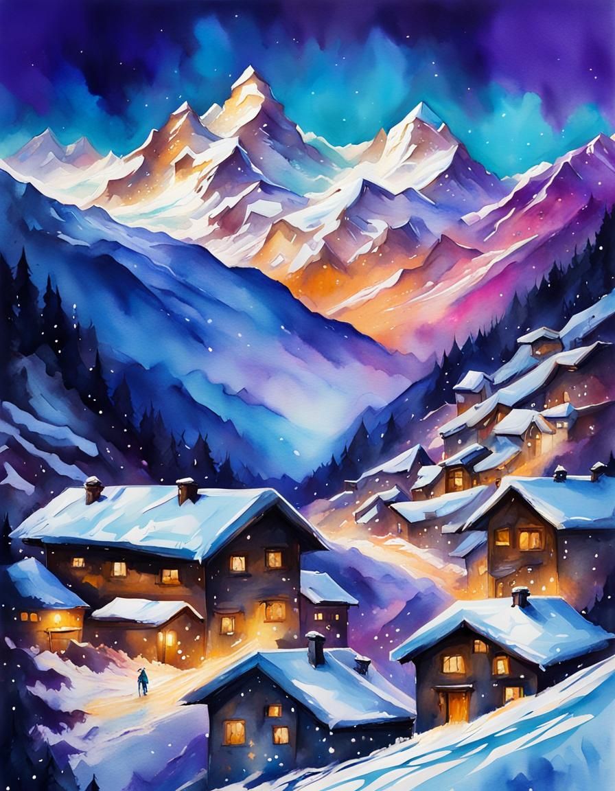 A vibrant image of the Swiss Alps at Christmas, decorated in white, blue, and purple. This watercolor-style artwork blends futuristic elements with graffiti and street art aesthetics.