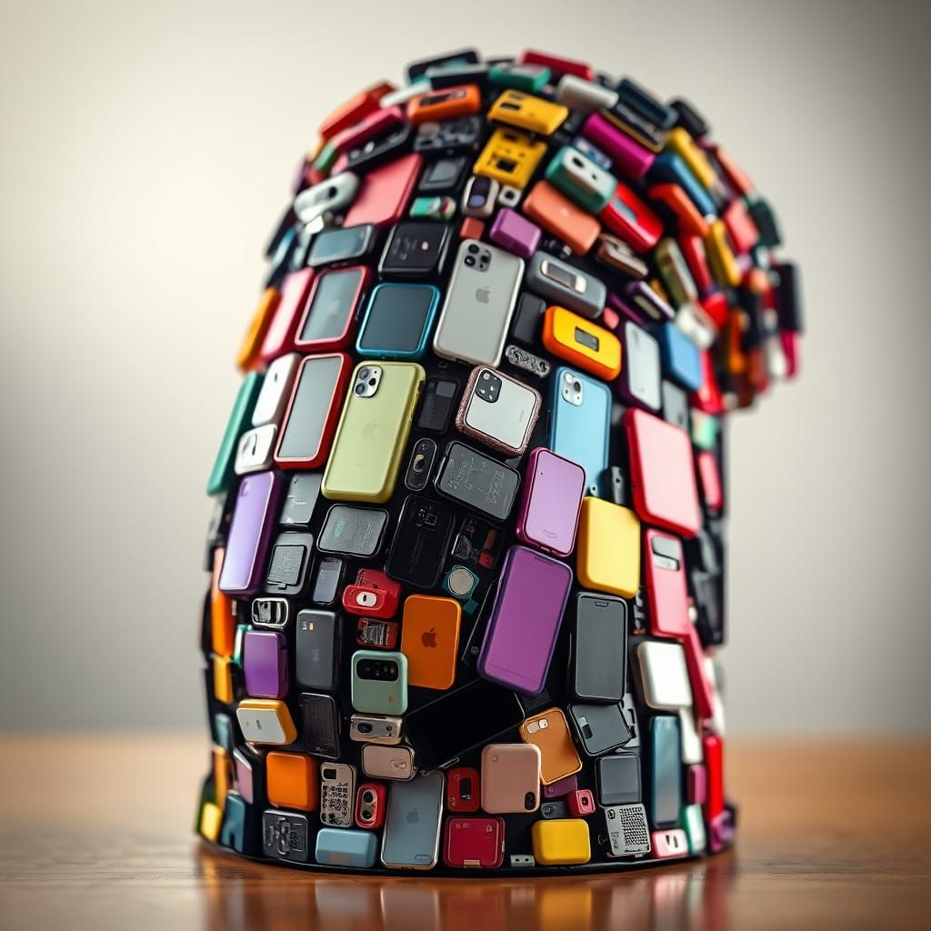 This hyperrealistic image showcases an avant-garde hat made from colorful smartphones, captured with sharp focus and soft bokeh in studio lighting.