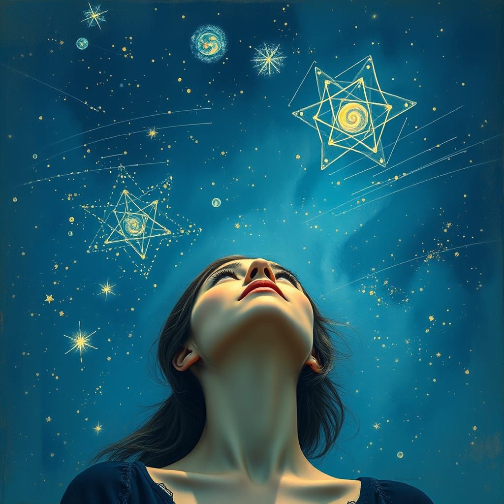 A striking picture of a woman looking up at a vibrant, star-filled night sky. The image evokes a dreamy, painterly aesthetic with soft textures and a mystical, atmospheric quality.
