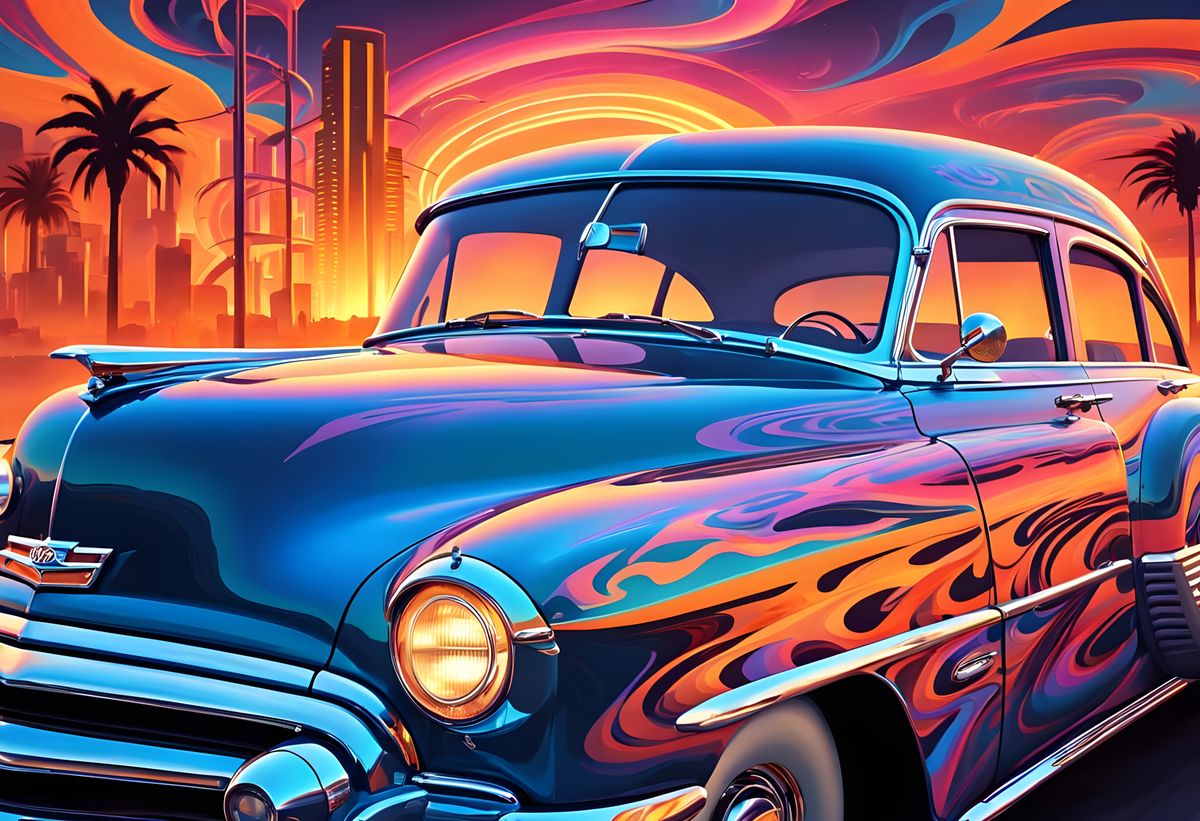 This image shows a vibrant 1950s Chevrolet Fleetline with swirling patterns, set against a neon cityscape. The artwork features fluid dynamic shapes and warm sunset hues in an airbrush art style.
