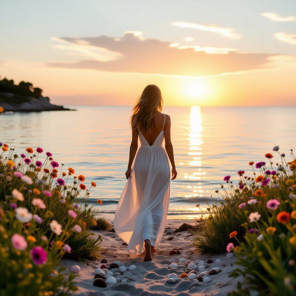 A serene woman walks alone on a tranquil bay at dawn, surrounded by wildflowers. Shot with noticeable film grain and meticulous color grading, the image evokes a cinematic style with dramatic lighting.